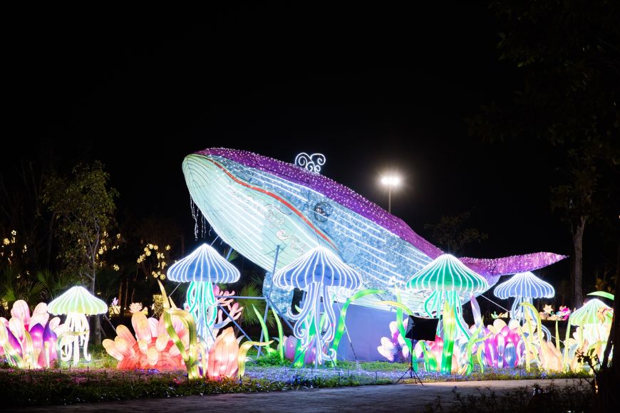 Khi đèn lên, cả khu rực rỡ như một lễ hội. Chụp cận cảnh các cụm đèn, phối thêm phụ kiện phát sáng để ảnh đêm nổi bật.