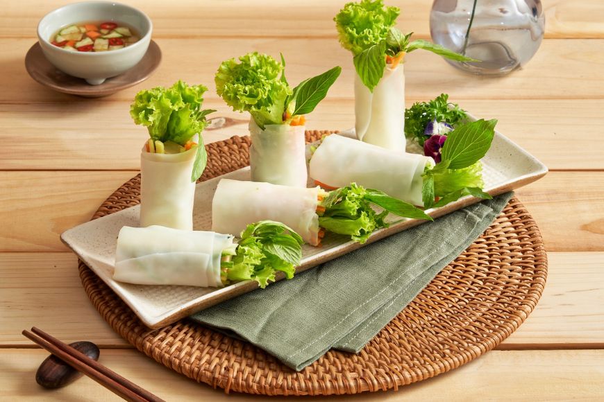 Cuốn chay tại đây không chỉ ngon mà còn đẹp mắt. Lớp bánh mỏng ôm trọn phần nhân đầy màu sắc từ rau củ, đậu hũ, nấm… chấm cùng nước sốt đậm đà, tạo nên tổng thể hài hòa và hấp dẫn.