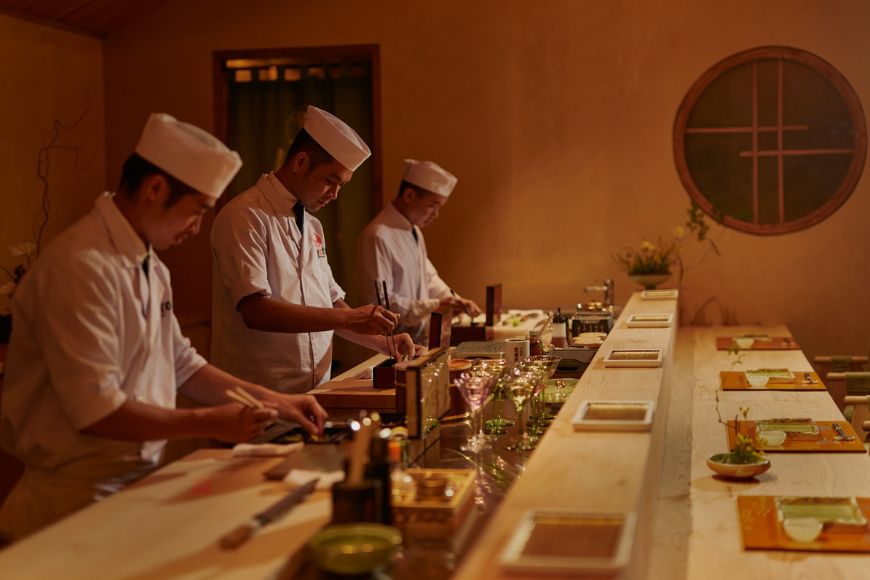 Không cần bay xa tới Tokyo, bạn vẫn có thể thưởng thức sushi, sashimi chuẩn Nhật ngay tại Kyoto Sachi - không gian đậm phong cách truyền thống với ánh đèn lồng, bàn gỗ tông trầm và hương vị omakase tinh tế.