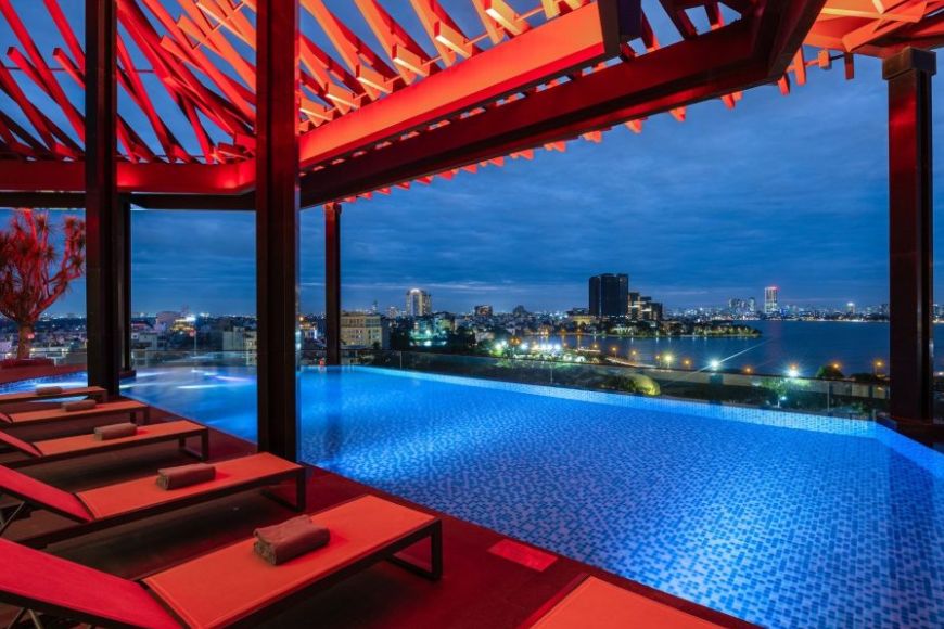 Hồ bơi ngoài trời trên tầng 9 là một trong những không gian thư giãn được yêu thích nhất tại khách sạn.