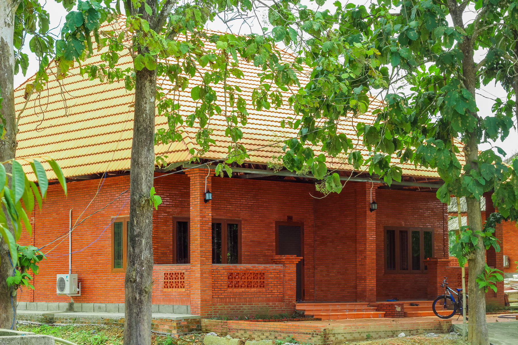 Mỗi phòng nghỉ được bao xung quanh bởi màu gạch đỏ truyền thống khiến chúng càng nổi bật giữa màu xanh mướt của thiên nhiên. Thiết kế của các phòng nghỉ đều hướng ra ao sen, núi, vườn trái cây và hồ. Tuy nhìn bên ngoài đơn sơ nhưng bên trong lại được đầu tư nội thất tiện nghi, hiện đại như bình nóng lạnh, wifi, máy điều hòa...