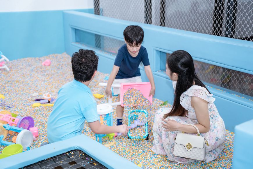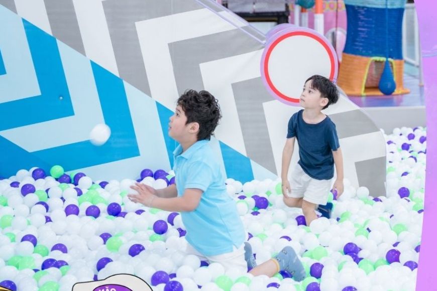 - Sáng tạo tại Kids Zone: Ba mẹ có thể chơi cùng bé tại hồ hạt sứ, nhà bóng hoặc các trò chơi tương tác như ném bóng, trượt cầu tuột, giúp bé vừa vui vừa học về màu sắc, phối hợp tay - mắt.