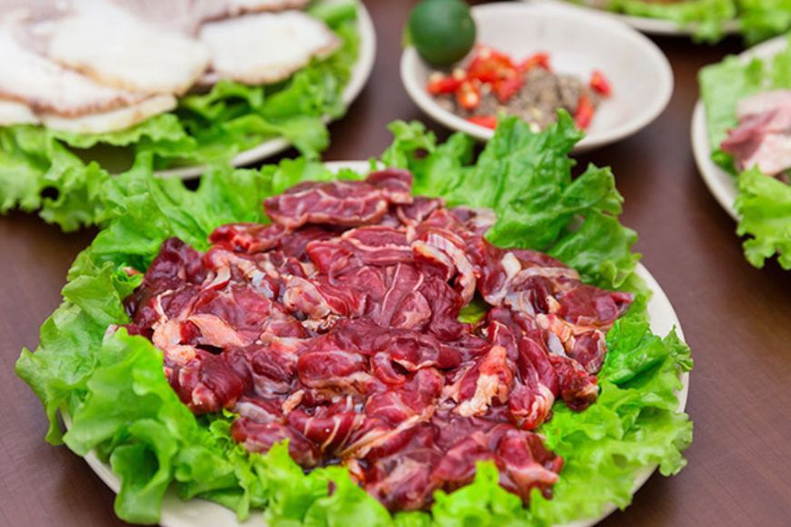 Không chỉ riêng thịt bò, các nguyên liệu ăn kèm như rau sống, bánh tráng hay gia vị đều được chuẩn bị chỉn chu. Chính sự tươi mới này đã góp phần tạo nên một bữa ăn không chỉ ngon miệng mà còn đảm bảo dinh dưỡng, phù hợp với nhiều đối tượng thực khách.