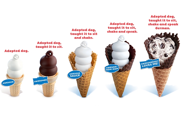 Với thông điệp đặc biệt: “ÚP NGƯỢC LY HAY MIỄN PHÍ”, Dairy Queen đã chinh phục các Fan trên toàn thế giới bằng việc thực hiện tuyên ngôn: Khách sẽ được phục vụ 1 ly miễn phí mới nếu trong 30 giây đầu tiên phục vụ món kem của bạn bị đổ khi úp ngược.