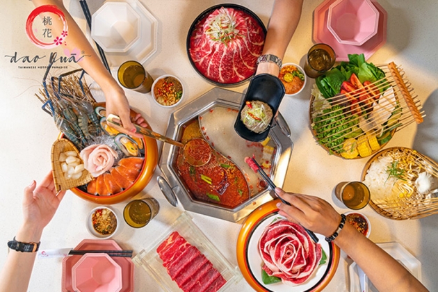 Để trở thành những "chuyên gia" lẩu Đài Loan cùng “Đào Hoa”, thực khách nên thực hiện từ bước chọn nước lẩu phù hợp cho mỗi ngăn cay và không cay, pha chế gia vị chấm đúng điệu sau đó đưa các món nhúng từ chuyền và cho vào từng ngăn lẩu và thưởng thức lẩu không giới hạn.