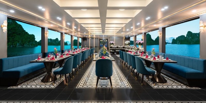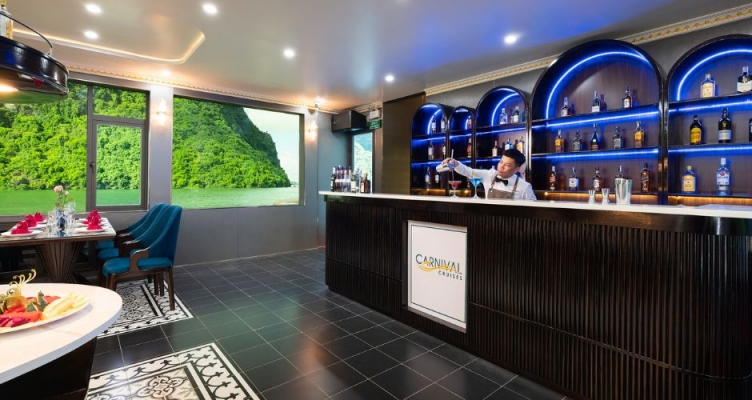 Với sức chứa lên đến 99 hành khách, du thuyền Carnival gồm 03 tầng được chia thành 02 nhà hàng cùng 01 sundeck rộng rãi. Không gian nội thất được chăm chút tỉ mỉ với bàn ghế gỗ, ghế nỉ nhập khẩu cao cấp mang lại cảm giác sang trọng nhưng không kém phần ấm cúng. Lan can kính toàn phần giúp du khách phóng tầm mắt ngắm nhìn cảnh sắc vịnh mà không gặp bất cứ vật cản nào - một thiết kế lý tưởng cho những người yêu thích chụp hình hay đơn giản là muốn đắm mình vào vẻ đẹp ngoạn mục của thiên nhiên.