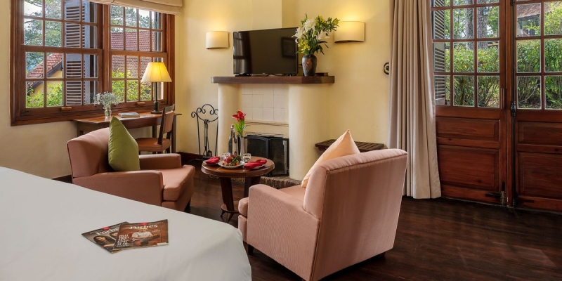 Phòng Villa Studio tại Ana Mandara Dalat rộng 40m², được thiết kế theo phong cách Pháp cổ điển đầy tinh tế, kết hợp hài hòa giữa nét truyền thống và tiện nghi hiện đại. Nội thất được lựa chọn chỉnh chu với gam màu ấm áp, tạo nên không gian thư giãn lý tưởng cho các cặp đôi hoặc du khách mong chờ sự riêng tư tuyệt đối giữa thiên nhiên tĩnh lặng của cao nguyên ngàn hoa.