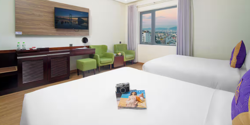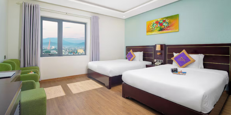 Hai giường lớn được bố trí thông minh tạo sự riêng tư cho từng thành viên, trong khi thiết kế hiện đại, tinh tế mang lại cảm giác sang trọng mà vẫn rất gần gũi. Từ ô cửa kính trong suốt, cảnh sắc thành phố Đà Nẵng thu nhỏ trong tầm mắt: ban ngày năng động, ban đêm lung linh như bức tranh ánh sáng.
