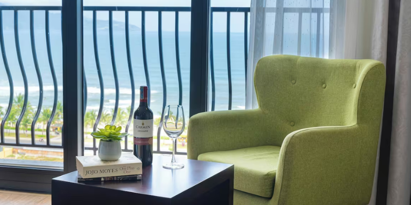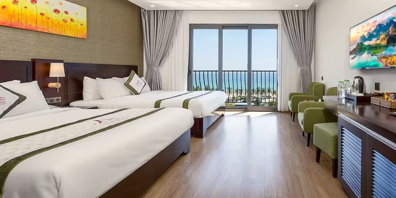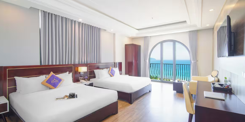 Điểm nhấn tuyệt đẹp của căn phòng chính là ban công hướng biển, nơi bạn có thể cùng những người thân yêu đón bình minh rực rỡ, nghe tiếng sóng vỗ dịu dàng hay tận hưởng làn gió đại dương mát lành ùa vào căn phòng. Đây là không gian lý tưởng để cả gia đình chia sẻ câu chuyện, chụp những bức ảnh kỷ niệm và thực sự sống chậm lại giữa nhịp sống hối hả.