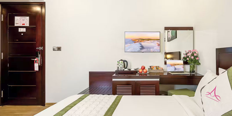 Phòng được trang bị đẩy đủ tiện nghi: giường ngủ êm ái, tivi, minibar, điều hòa, phòng tắm hiện đại… tất cả sẵn sàng mang đến một kỳ nghỉ trọn vẹn và tinh tế.