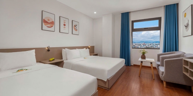 Với diện tích 30m², phòng Deluxe Triple City View được bố trí khoa học, gồm 1 giường lớn 1m6 và 1 giường nhỏ 1m2, phù hợp cho 3 khách lưu trú. Không gian phòng nổi bật với thiết kế hiện đại, nội thất sang trọng, gam màu hài hòa, mang lại cảm giác vừa ấm cúng vừa tinh tế. Từ cửa sổ, du khách có thể ngắm nhìn nhịp sống sôi động của thành phố biển Đà Nẵng về đêm, hay tận hưởng ánh nắng ban mai rực rỡ mỗi sớm mai.