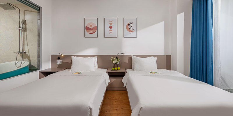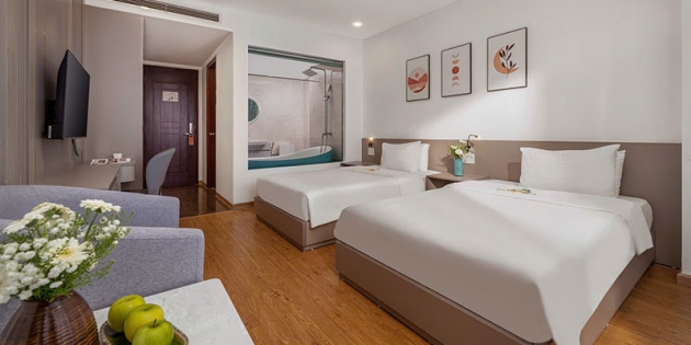 Với diện tích 35m², phòng Grand Sea View được thiết kế hiện đại, trang nhã và đầy đủ tiện nghi. Bố trí thông minh với 1 giường lớn 1m6 và 1 giường nhỏ 1m2, căn phòng phù hợp cho gia đình nhỏ hoặc nhóm bạn muốn tận hưởng kỳ nghỉ thoải mái cùng nhau. Điểm nhấn đặc biệt chính là tầm nhìn hướng thẳng ra biển Mỹ Khê – nơi bạn có thể đón ánh bình minh rực rỡ hay lắng nghe tiếng sóng vỗ về mỗi khi màn đêm buông xuống.