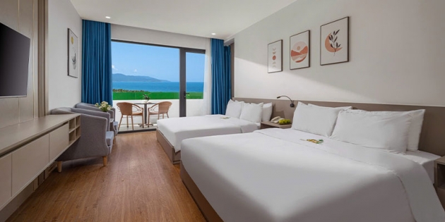 Với diện tích 40m², hạng phòng Premier Family Ocean View được thiết kế thoáng đãng, trang nhã và hiện đại. Phòng được bố trí 2 giường lớn 1m6, phù hợp cho nhóm bạn hoặc gia đình có trẻ nhỏ, mang đến sự tiện nghi và thoải mái tối đa. Nội thất tinh xảo, gam màu ấm cúng cùng cửa sổ rộng mở ra khung cảnh biển Mỹ Khê tuyệt đẹp, cho bạn trải nghiệm những phút giây thư giãn đúng nghĩa.