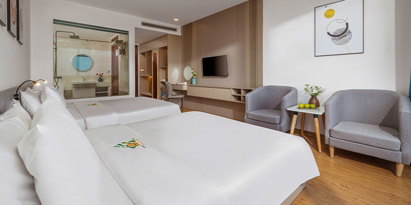 Mọi trang thiết bị trong phòng đều được chuẩn bị chu đáo: TV màn hình phẳng, minibar, bàn làm việc, máy sấy tóc, tủ quần áo và nhiều tiện ích khác. Bạn sẽ cảm nhận được sự tiện lợi trong từng chi tiết nhỏ, giúp kỳ nghỉ trở nên dễ chịu và thoải mái hơn.
