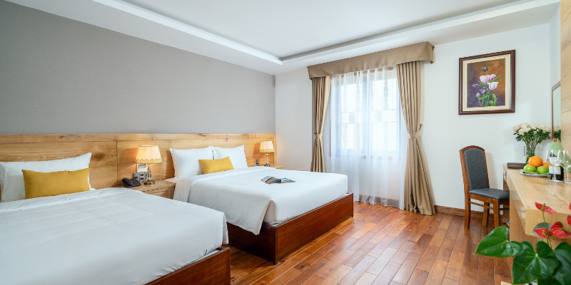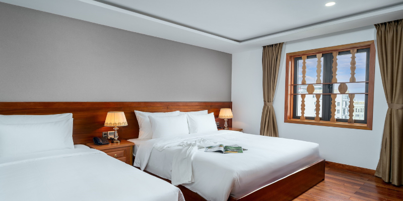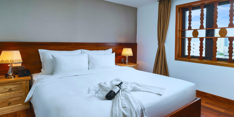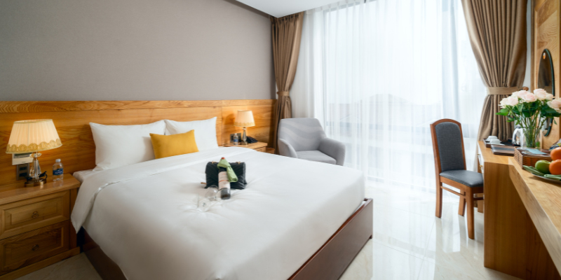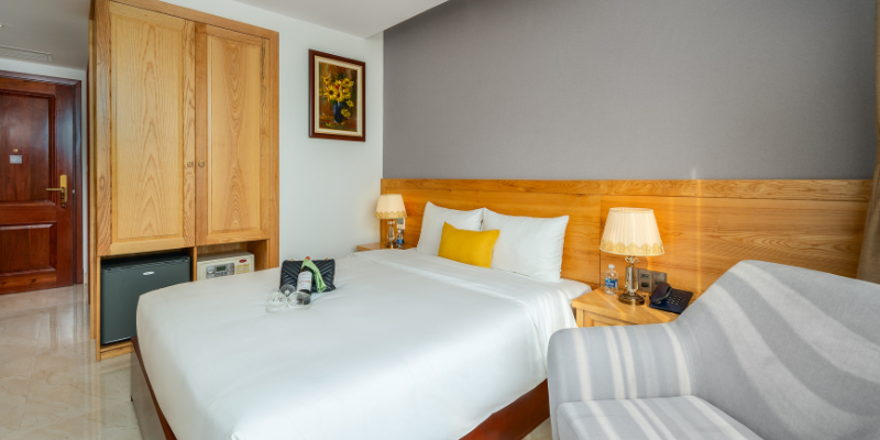 Với diện tích khoảng 25m², phòng Deluxe tại Sunny Ocean Hotel & Spa được thiết kế tối ưu cho sự thoải mái và tính thẩm mỹ. Từng chi tiết nội thất đều được lựa chọn kỹ lưỡng, sử dụng chất liệu chất lượng cao mang đến cảm giác sang trọng nhưng vẫn gần gũi. Ánh sáng tự nhiên chan hòa từ cửa sổ lớn giúp căn phòng luôn thoáng đãng, tạo cảm giác thư giãn ngay khi bước vào.