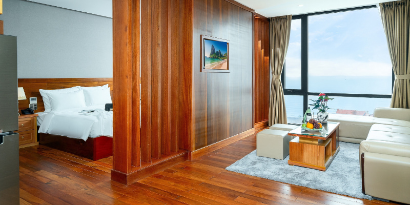 Bước vào phòng Suite City View, du khách lập tức cảm nhận được sự tinh tế trong từng chi tiết. Với diện tích khoảng 40m², căn phòng mang đến sự rộng rãi hiếm thấy trong phân khúc, lý tưởng cho các cặp đôi, du khách nghỉ dưỡng hoặc những ai cần không gian thoải mái để tái tạo năng lượng.