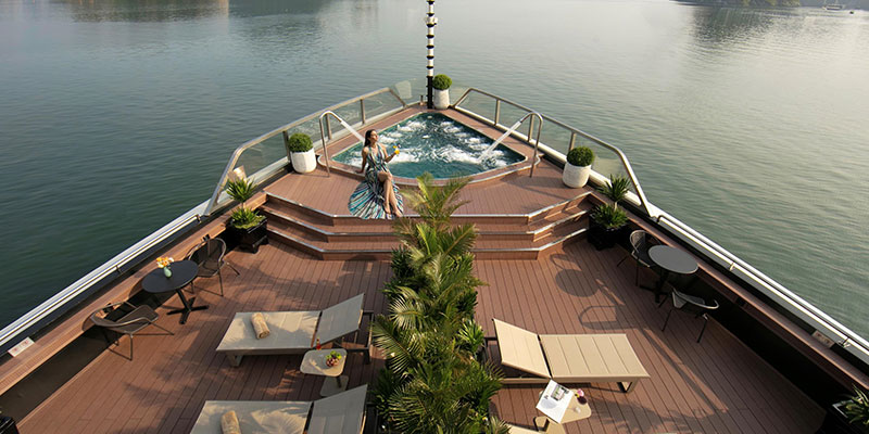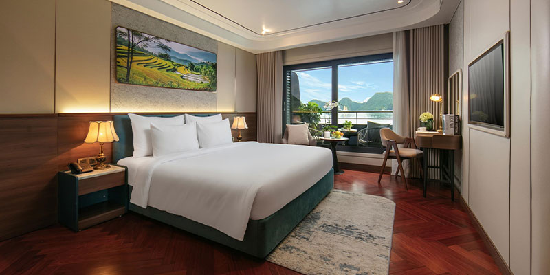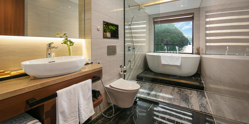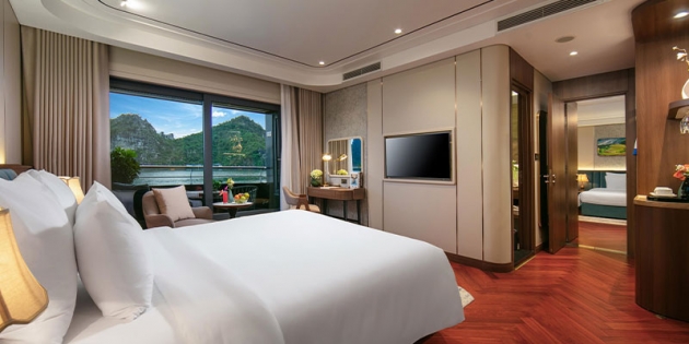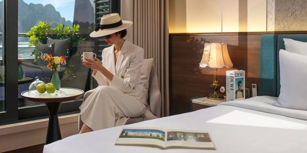 Từ ô cửa kính rộng mở, khung cảnh vịnh Hạ Long như một bức tranh sống động hiện ra trước mắt: những khối đá vôi sừng sững giữa mặt nước trong veo, tiếng sóng khẽ vỗ vào mạn tàu, và gió biển mang theo mùi muối mằn nồng – tất cả tạo nên cảm giác thư thái, bình yên đến lạ. Bên trong phòng, từng chi tiết được chăm chút tỉ mỉ – nội thất gỗ sang trọng, giường ngủ êm ái, phòng tắm riêng biệt với bồn tắm hướng biển, tất cả mang lại sự thoải mái, riêng tư mà vẫn gắn kết.