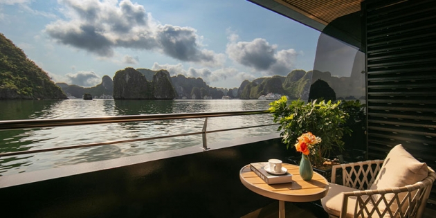 Từ ban công riêng, bạn có thể phóng tầm mắt ra khung cảnh mênh mông của vịnh – nơi từng con sóng lấp lánh dưới ánh nắng, từng hòn đảo đá vôi sừng sững soi bóng xuống mặt nước phẳng lặng.