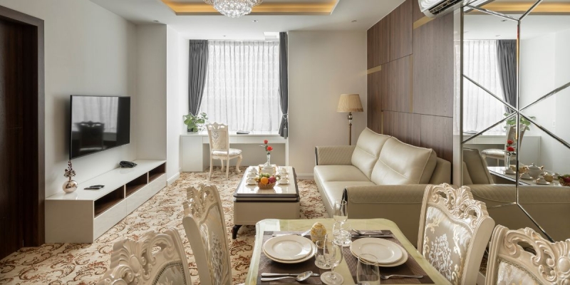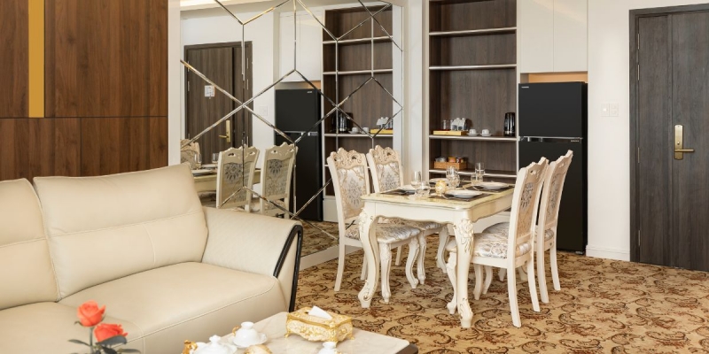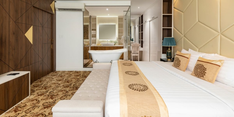 Không gian được thiết kế hiện đại, tối ưu trải nghiệm nghỉ ngơi với giường ngủ cao cấp êm ái cùng hệ thống tiện nghi đầy đủ như điều hòa, TV màn hình lớn, wifi tốc độ cao, khu vực làm việc tiện lợi và phòng tắm riêng sang trọng. Ngoài ra, khách lưu trú còn được phục vụ trà, cà phê và nước uống miễn phí mỗi ngày, tạo nên không gian lưu trú lý tưởng cho cả kỳ nghỉ dài ngày lẫn những chuyến công tác cao cấp.