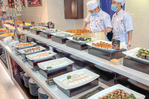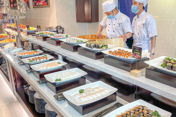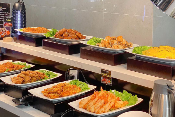 Ngoài Sushi Sashimi các loại, nhà hàng còn chuẩn bị rất nhiều các món ăn khác tại quầy line như súp, mì Udon, mì Sopu, salad, món chiên kiểu Nhật, món tráng miệng, trà,... đa dạng theo ngày để khách hàng có thể sử dụng kèm.