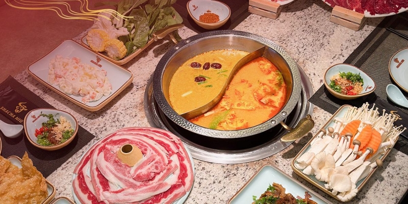 Đi kèm là hệ thống buffet line phong phú với hơn 150 món đồ nhúng, rau nấm, các món khai vị chiên rán kiểu Trung Hoa, và đặc biệt không thể thiếu quầy sốt Shacha với hơn 20 loại sốt cho thực khách tự pha chế theo khẩu vị riêng.