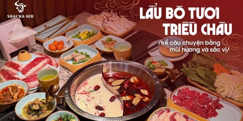 Nhà hàng Shacha Niú tọa lạc tại số 26 Lương Định Của, Hà Nội là một trong những điểm đến ẩm thực nổi bật dành cho thực khách yêu thích buffet lẩu. Tại đây, tinh hoa ẩm thực Triều Châu được tái hiện đầy tinh tế qua không gian đậm chất Trung Hoa cổ đại, kết hợp hài hòa cùng tiện nghi hiện đại. Với khu vực rộng rãi được bố trí linh hoạt theo mùa, Shacha Niú dễ dàng đáp ứng nhu cầu cho các buổi tụ họp gia đình, bữa tối riêng tư hay tiệc công ty đông người.