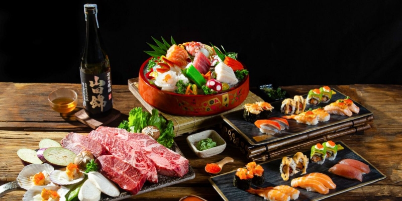 Bộ sưu tập Sashimi tươi ngon được chế biến từ nguồn nguyên liệu tinh tuyển với quy trình công phu, nghiêm ngặt: cá ngừ, cá hồi, cá kiếm, cá trích, bạch tuộc, sò đỏ,… Cùng với đó là hơn 20 loại Sushi hảo hạng, bắt mắt, hay thực đơn món khai vị, món nóng kiểu Nhật đưa miệng.