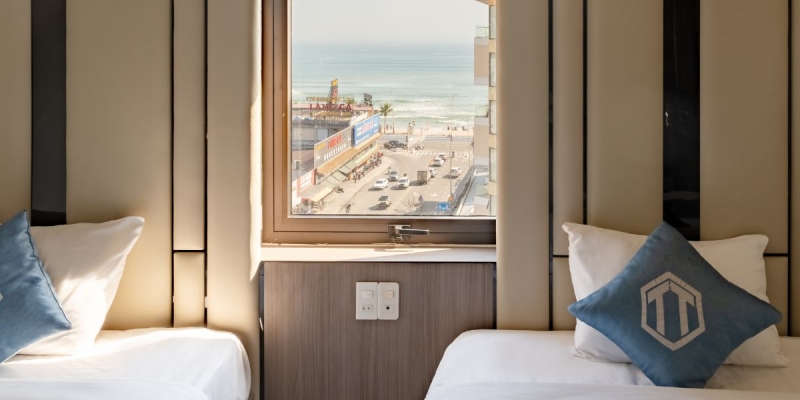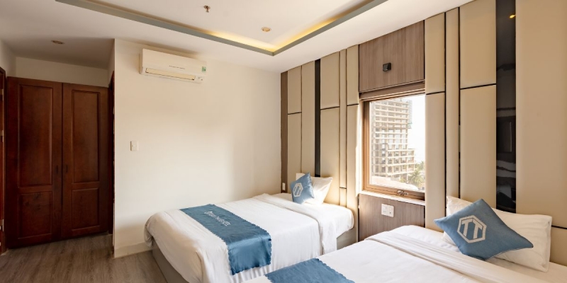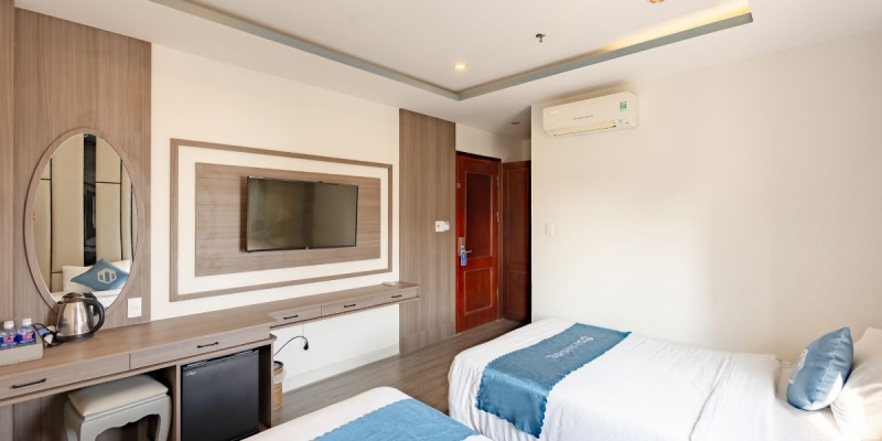Phòng Deluxe Twin Sea View rộng 30m2, nổi bật với tầm nhìn mở ra biển xanh và thành phố năng động. Không gian phòng tận dụng ánh sáng tự nhiên kết hợp nội thất thanh lịch, tạo cảm giác thư thái, rộng rãi cho khách lưu trú. Thiết kế tập trung vào sự tiện lợi, đáp ứng nhu cầu sử dụng linh hoạt của nhóm bạn hoặc khách gia đình.