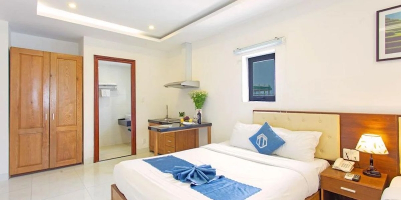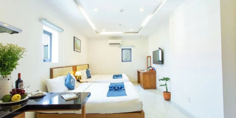 Phòng Family tại Toan Thang Beach Hotel sở hữu diện tích 40m2, thiết kế phù hợp cho các gia đình muốn cùng nhau tận hưởng không gian riêng nhưng vẫn gần gũi. Mỗi phòng đều lắp đặt điều hòa, phòng tắm riêng hiện đại, bàn làm việc cho cha mẹ và khu vực ghế ngồi thư giãn. View thành phố từ phòng giúp bạn lưu giữ khoảnh khắc sống động của Đà Nẵng về đêm. Không gian sáng, sạch sẽ và bố trí hợp lý là điểm cộng lớn.