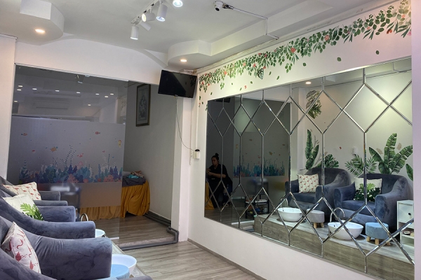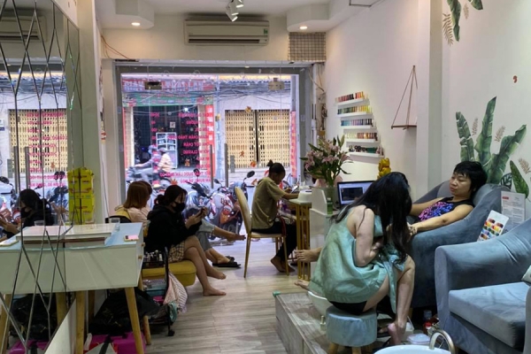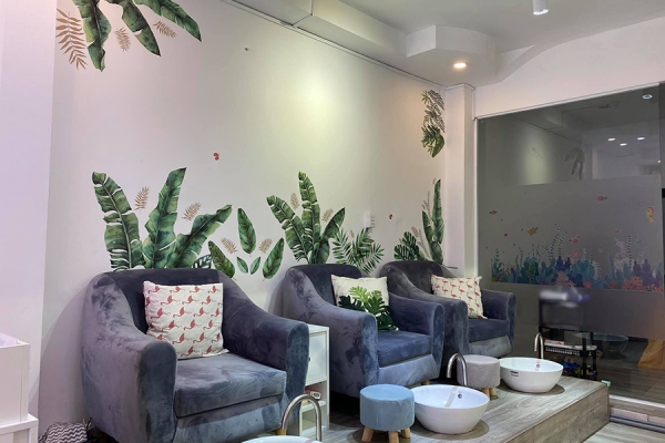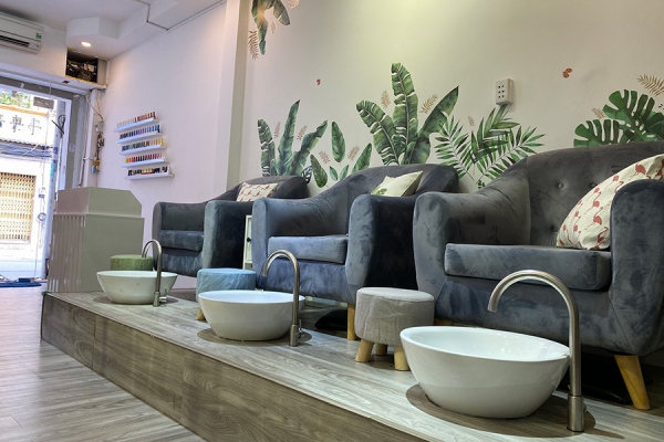 Những bộ bàn ghế làm móng êm ái cùng nhiều kệ gỗ trưng bày các sản phẩm làm đẹp, tạo sự yên tâm, tin tưởng cho bất cứ ai khi sử dụng dịch vụ.