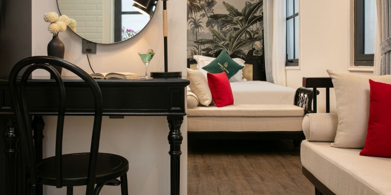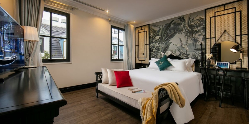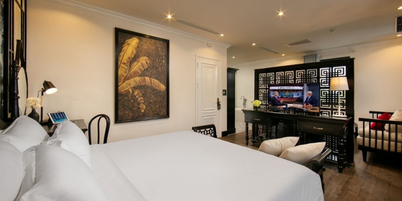 Grand Suite rộng 40m2 là lựa chọn hoàn hảo cho 2 khách muốn tận hưởng không gian riêng tư, sang trọng mà vẫn ấm cúng. Thiết kế nội thất hài hòa, trang bị đầy đủ tiện nghi hiện đại như điều hòa, TV màn hình phẳng, minibar, két an toàn, khu vực tiếp khách, phòng tắm riêng với vòi sen. Mỗi ngày, khách nhận miễn phí trà, cà phê cùng 2 chai nước suối mới, đảm bảo trải nghiệm tiện lợi và dễ chịu nhất.