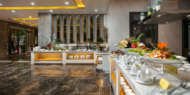 - Bữa sáng buffet nhẹ nhàng, đa dạng món Việt và quốc tế tại nhà hàng khách sạn.
