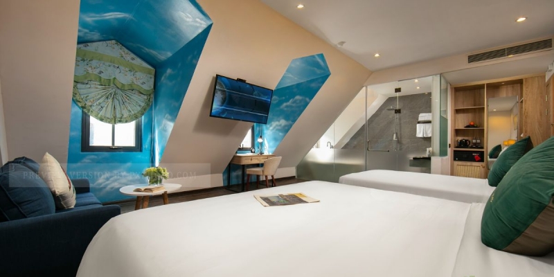 Phòng Premium Family có diện tích 28-30m2, thiết kế thoáng đãng, trang bị giường êm ái, điều hòa, TV màn hình phẳng, minibar, két an toàn và phòng tắm riêng biệt với vòi sen hiện đại. Không gian phòng phù hợp cho 3 khách nghỉ ngơi thoải mái, đặc biệt lý tưởng cho gia đình nhỏ hay nhóm bạn du lịch cùng nhau. Sự tươi mới, sạch sẽ và đầy đủ tiện nghi sẽ giúp bạn hoàn toàn yên tâm nghỉ dưỡng sau hành trình khám phá Hạ Long.