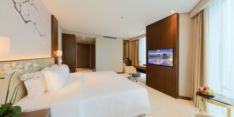 Phòng Premium tại Grand Vista Hanoi có diện tích 38m², tọa lạc từ tầng 7 đến tầng 16, mang đến khung cảnh tuyệt mỹ hướng ra hồ Giang Võ. Thiết kế hiện đại với nội thất gỗ cao cấp cùng điểm nhấn hoa anh đào kiểu Việt Nam vừa tạo cảm giác ấm áp, vừa sang trọng và thư giãn tuyệt vời cho du khách.