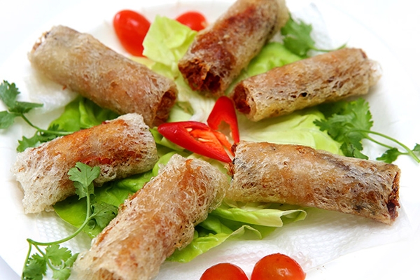 Chả giò cua được chế biến từ thịt cua, trứng gà, thịt heo bằm, nấm hương…, và theo bí quyết riêng của Quán cua Út Kiệt. Chả giò cuốn vừa phải, chiên giòn vỏ ngoài, mềm thơm bên trong. Khi ăn hãy dùng nóng, chấm với một chút tương ớt hoặc nước mắm pha chua ngọt để tăng thêm hương vị đậm đà. Món ăn kèm cùng rau sống để bớt ngán vị dầu mỡ.