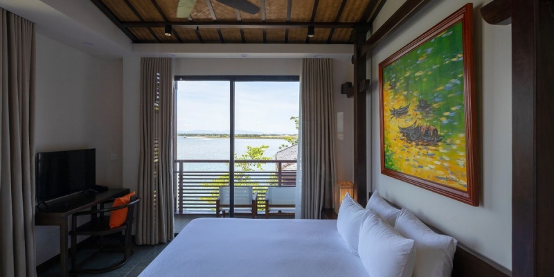 Phòng Suite River View là lựa chọn tuyệt vời cho khách yêu thích cảm xúc thư thái và ngắm cảnh sông nước. Sở hữu diện tích 30m2, phòng có ban công riêng hướng ra Thu Bồn, thiết kế lấy cảm hứng từ nét văn hóa Việt Nam truyền thống. Nghệ thuật trưng bày những linh vật Nghệ cùng gam màu ấm cúng giúp du khách có cảm giác trở về miền ký ức yên bình, vừa hiện đại vừa truyền thống, lý tưởng cho các khoảnh khắc nghỉ dưỡng đáng nhớ.