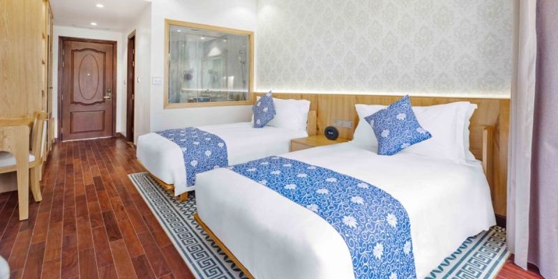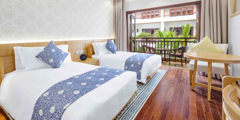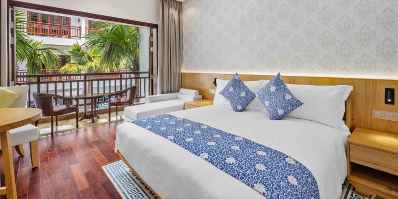 Phòng Faifo là lựa chọn hoàn hảo cho khách cần sự riêng tư và tiện nghi. Thiết kế hiện đại, nội thất gọn gàng và sang trọng, có thể phục vụ tốt nhu cầu lưu trú của cặp đôi hoặc gia đình nhỏ. Một số phòng còn có hướng nhìn ra khu hồ bơi xanh mát, giúp khách tận hưởng khoảnh khắc thư giãn mỗi sáng thức dậy hay chiều về khi ngắm ánh hoàng hôn lặng lẽ phủ qua rèm cửa.