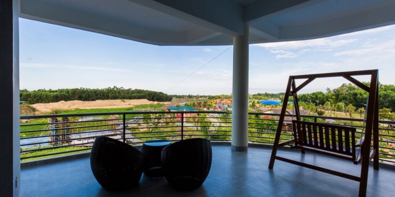 - Ban công view xanh mát nhìn ra hồ bơi và công viên nước giúp tăng cảm giác thư thái.