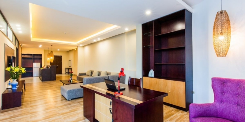 - Bếp cá nhân gồm ấm đun nước, tủ lạnh nhỏ (áp dụng một số phòng), bàn làm việc rộng rãi.