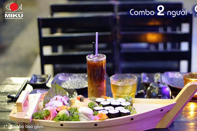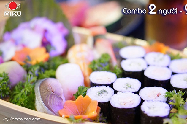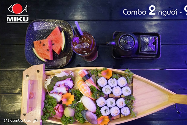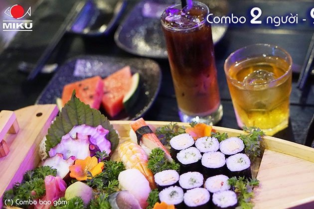 Chi tiết “Set Sashimi, Sushi, Maki và nước uống cho 02 người tại Miku Sushi” bao gồm: