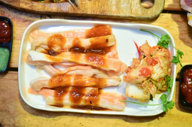 Bắt đầu bữa tiệc buffet sôi động, thực khách có thể "khởi động" với vài món khai vị nhẹ nhàng như Salad khu vườn, Salad dầu giấm, Gỏi cá mai với nước sốt đậu phộng, Gỏi xoài tôm khô, Kim chi cải thảo...