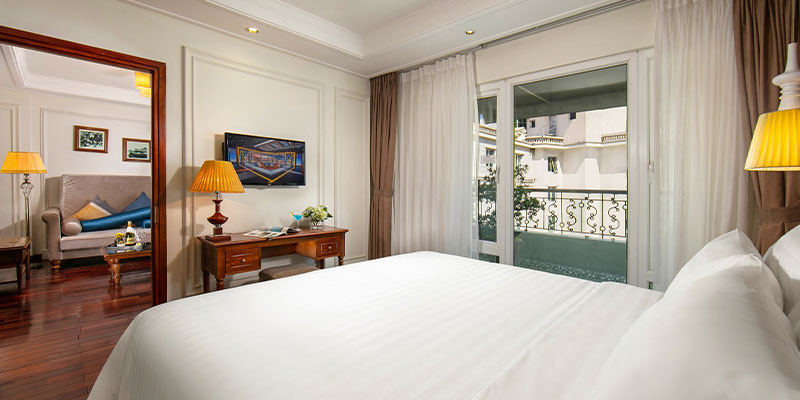 Phòng được trang bị giường King lớn êm ái, cùng khu vực phòng khách riêng biệt và ban công rộng thoáng nhìn ra City View – nơi bạn có thể thả hồn vào bức tranh phố phường Hà Nội từ trên cao. Mỗi sáng, chỉ cần mở cửa ban công, đón làn gió nhẹ cùng ánh nắng dịu, bạn sẽ cảm nhận trọn vẹn nhịp sống bình yên nhưng đầy sức sống của Thủ đô.