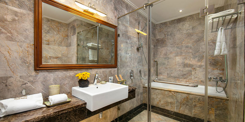 Bên cạnh đó, phòng được trang bị toàn bộ tiện nghi hiện đại: TV màn hình phẳng, minibar, bàn làm việc, két sắt, máy pha cà phê, phòng tắm sang trọng với bồn tắm lớn và vòi sen cao cấp. Từng chi tiết được chăm chút tỉ mỉ, tạo nên không gian chuẩn nghỉ dưỡng 4 sao quốc tế – nơi bạn có thể nghỉ ngơi, làm việc hoặc tận hưởng khoảnh khắc riêng tư một cách trọn vẹn nhất.