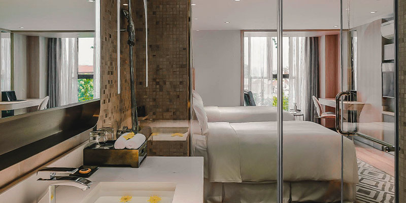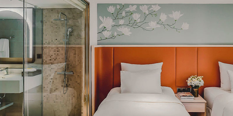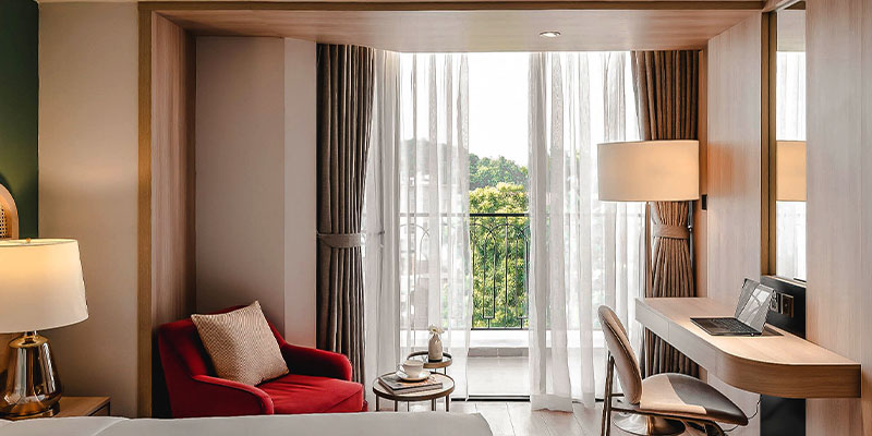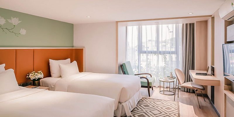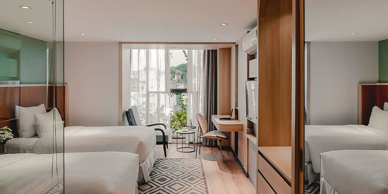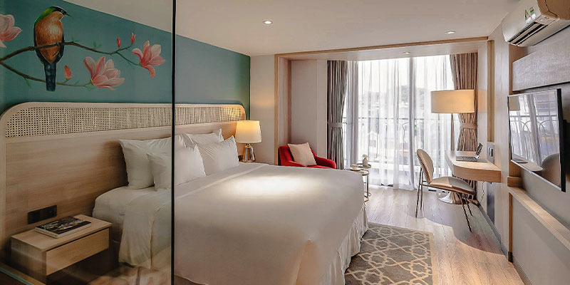 Mở cánh cửa sổ lớn, cả khung cảnh thành phố hiện ra sống động: những mái nhà phố cổ, hàng cây xanh và dòng người tấp nập dưới ánh nắng dịu nhẹ. Vừa nhâm nhi tách trà, vừa ngắm nhịp sống Hà Nội từ trên cao – đó chính là một trong những khoảnh khắc khiến du khách nhớ mãi khi lưu trú tại đây.