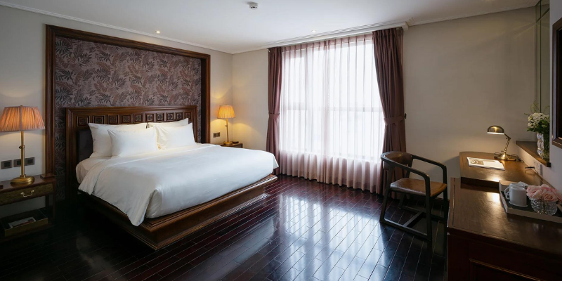 Phòng Premier có diện tích khoảng 35m², được thiết kế nhẹ nhàng, phóng khoáng với tông màu trung tính và nội thất tinh tế. Cửa sổ lớn hướng về phía thành phố mang lại ánh sáng tự nhiên cùng cảm giác thoáng đãng, thư thái mỗi sáng thức dậy. Phòng có 1 giường King cỡ lớn, có thể kê thêm giường phụ nếu yêu cầu, phù hợp với nhóm 2-3 người lớn.