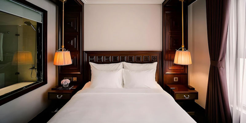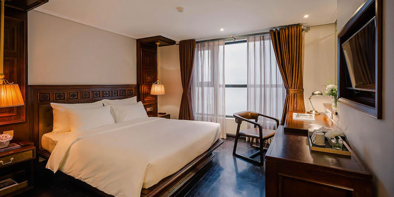 Phòng nghỉ có diện tích khoảng 28m², được thiết kế theo phong cách hiện đại xen lẫn dấu ấn Đông Dương trang nhã. Với tùy chọn 1 giường Queen hoặc 2 giường đơn, kết hợp ánh sáng tự nhiên từ cửa sổ lớn và tông màu nhẹ nhàng, mỗi căn phòng tạo nên một nơi trú ẩn bình yên giữa phố thị.