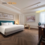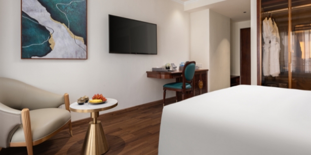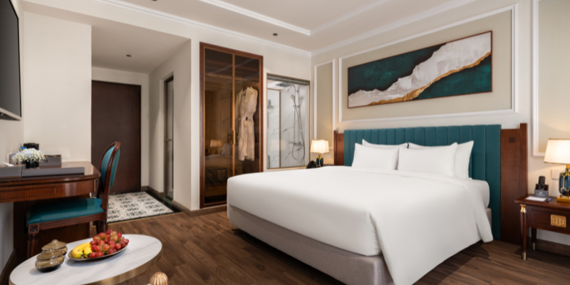 Tông màu trầm ấm chủ đạo tạo cảm giác thư thái, dễ chịu; nội thất sang trọng được chăm chút trong từng chi tiết – từ giường Double/Twin êm ái, bàn làm việc, ghế thư giãn, cho đến phòng tắm hiện đại – tất cả nhằm mang đến cho du khách một không gian nghỉ ngơi đẳng cấp và trọn vẹn.