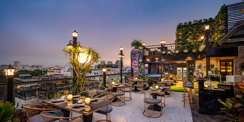 Đừng quên ghé Sky Bar tầng thượng – không gian lý tưởng để ngắm toàn cảnh Hồ Hoàn Kiếm và thành phố lên đèn, thưởng thức ly cocktail mát lạnh hoặc rượu vang hảo hạng, để từng khoảnh khắc trở nên đáng nhớ hơn bao giờ hết.