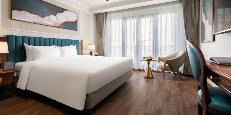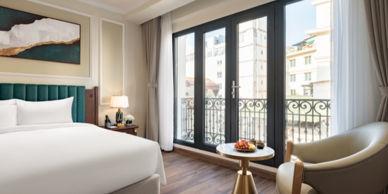 Điểm nhấn đặc biệt của hạng phòng này là ban công riêng hướng City View, nơi bạn có thể hít thở không khí trong lành buổi sớm, ngắm nhìn nhịp sống phố phường Hà Nội hay nhâm nhi tách cà phê ấm nóng giữa ánh nắng ban mai – một khởi đầu hoàn hảo cho ngày mới.