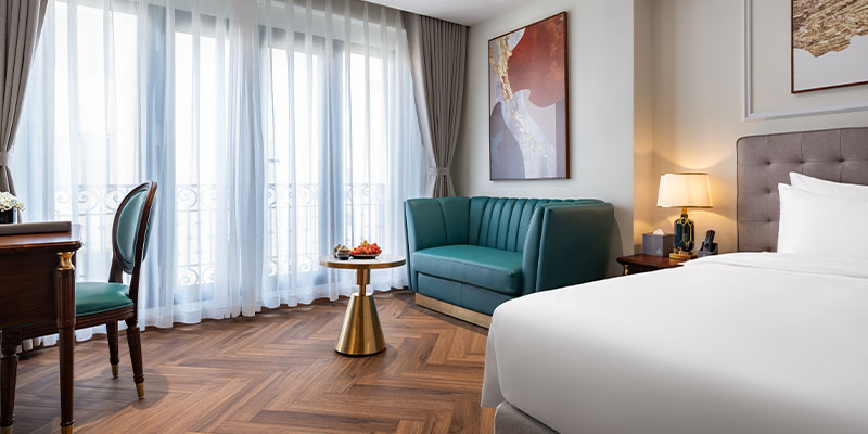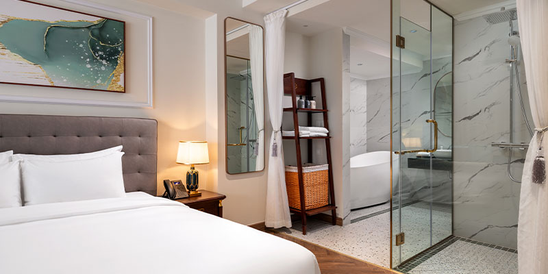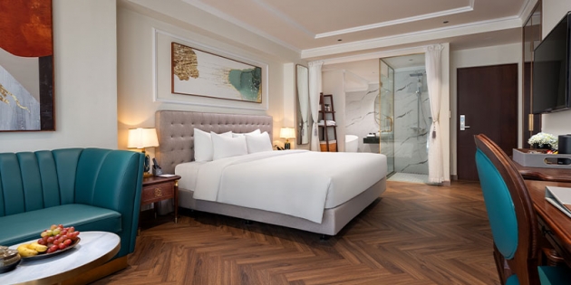 Bước vào Royal Suite, du khách như được đắm mình trong một bản giao hưởng của sự tinh tế – nơi hơi thở cổ điển Á Đông gặp gỡ phong cách kiến trúc châu Âu hiện đại. Mỗi góc nhỏ đều toát lên vẻ quyến rũ riêng: phòng khách ấm cúng để thưởng trà, phòng ngủ rộng rãi ngập tràn ánh sáng, và phòng tắm hiện đại – nơi bạn có thể thư giãn trong làn nước ấm, lắng nghe bản nhạc nhẹ giữa không gian tĩnh lặng của thành phố.